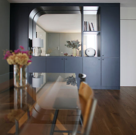 Description : réalisation sur mesure d'un vaisselier et d'un meuble bas entourant la cheminée existante,